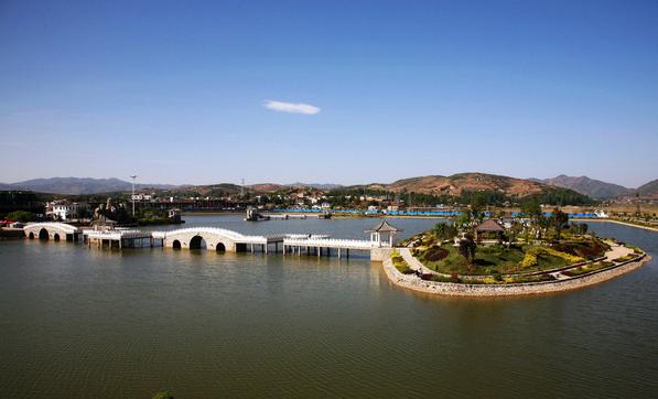 太陽湖位于縣城南郊,東臨巧威公路過境線,西接鳴樓自然村,占地面積320畝。園區(qū)整體布局主要由水體湖面、小島嶼、環(huán)湖公路和商業(yè)區(qū)四個部分組成。太陽湖呈蝴蝶型鑲嵌于城郊平壩中央,水體面積為16萬平方米,湖面水深2.2米。湖畔有島嶼3個,在島上設置了八角亭及長廊等江南風格園林設施,拱型廊橋?qū)⒐聧u與小島連為一體,形成湖中有島、小島四面迎水的秀美景觀。