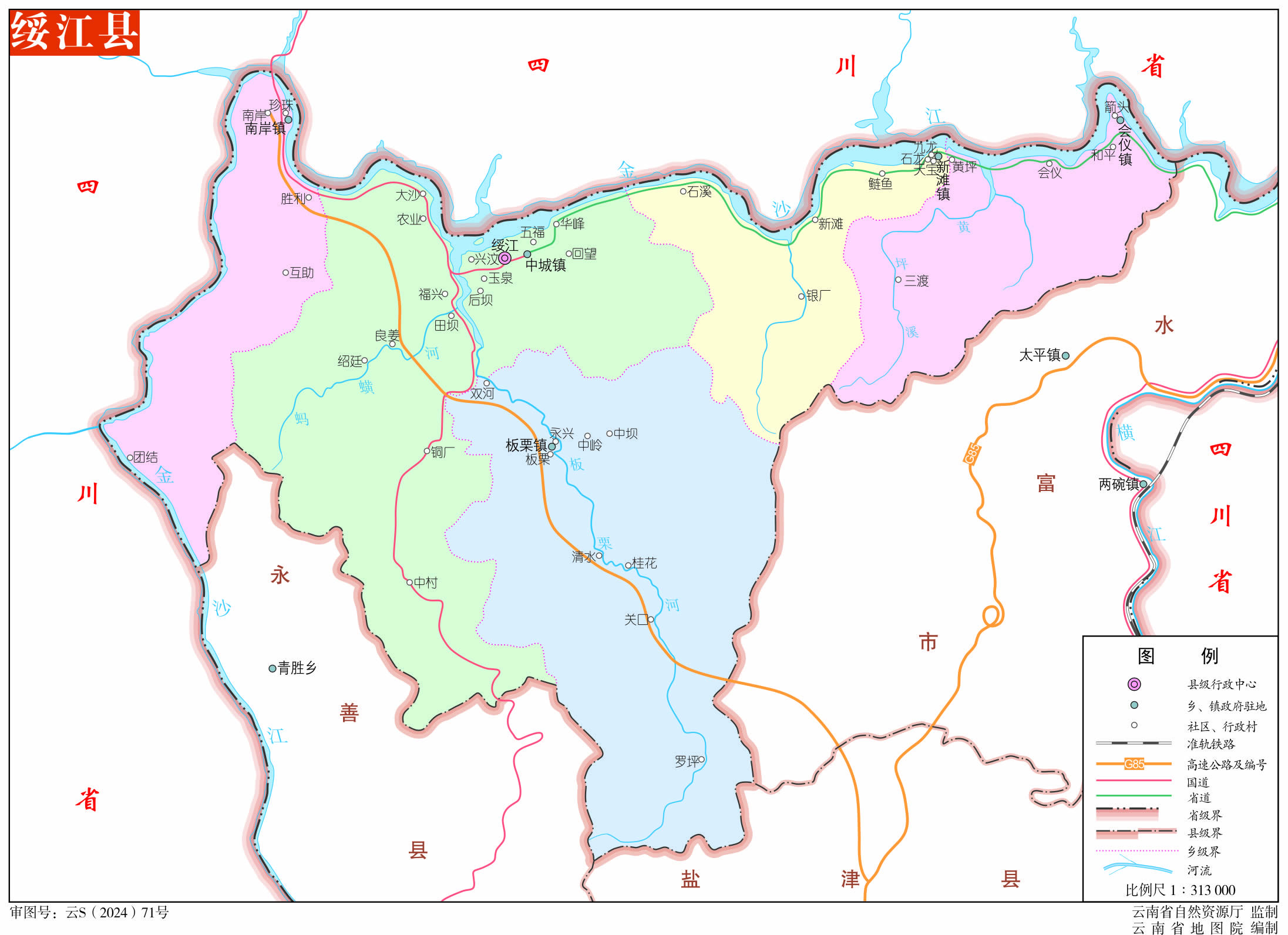 位置境域 綏江縣,位于云貴高原滇東北部邊緣。東接水富市,南連鹽津縣,西與永善縣接壤,西北和北部隔金沙江與四川雷波縣、屏山縣相鄰。最大橫距48.5公里,最大縱距36公里,總面積761平方公里。