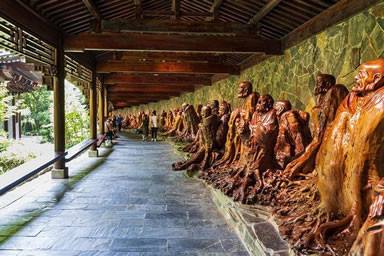 以根雕藝術(shù)展現(xiàn)佛教文化的圣地,是由千年樹(shù)神匯聚的藝術(shù)殿堂,建筑面積1.2萬(wàn)平方米,縱深有三座大殿,第一幢為雙層結(jié)構(gòu),第二第三幢均為單層結(jié)構(gòu)。兩邊另有羅漢文化長(zhǎng)廊依山而建,環(huán)繞其間,有未來(lái)佛殿、大雄寶殿、羅漢堂等,陳列有釋迦牟尼、未來(lái)佛、四大菩薩、四大天王、五百羅漢等佛教文化系列巨型根雕作品一千余件,其中最大的根雕釋迦牟尼主佛,形體龐大,重達(dá)40余噸,根材花巨資,于中緬邊境一路繞道跋涉而來(lái),經(jīng)醉根“點(diǎn)化”,巍然成佛!五百羅漢陣更是氣勢(shì)雄偉,長(zhǎng)達(dá)680余米,整體布局渾厚古雅,堪稱中華一絕、世界之最。
