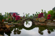 地處根宮佛國(guó)文化旅游區(qū)山麓,緊依根雕佛國(guó),有醉松亭、日月亭、回思廊、靜心亭、樂(lè)禽園等景觀建筑,陳列有以松柏類為主的盆景藝術(shù)作品1500余盆,造型博采眾長(zhǎng),創(chuàng)意自然,有小橋流水田舍人家的水旱盆景,有濃縮華山天險(xiǎn)附石盆景,有的以石為盆回歸自然,有的三五成林意境高遠(yuǎn),大自然的千奇百怪,于方寸間一覽無(wú)余,具有空中花園美譽(yù)。