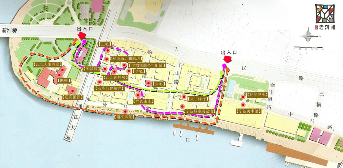 1842年鴉片戰(zhàn)爭后,清政府簽訂了《南京條約》, 寧波作為五口通商口岸之一,各國商人蜂擁至寧波,英、法等國采用奪取主權(quán),建立據(jù)點(diǎn),霸占海關(guān)、控制?冢瑝艛嗪竭\(yùn),推行洋化等一系列手段,把寧波港扭曲成半殖民地性質(zhì)的港口。1844年正式開埠。不久,江北岸便發(fā)展成為英、法、美三國僑民居留區(qū)域。歷史上也稱為“外灘”,其開埠歷史比上海外灘還要早上20年,是目前中國最古老的外灘之一,一直到上?诎夺绕穑瑢幉ǹ诎兜牡匚徊疟恢饾u削弱。1927年,中國政府收回了江北岸外人居留地的行政管理權(quán)江北外灘也在歲月的洗禮中完整地記錄下了近代寧波的歷史變化,體現(xiàn)西方工業(yè)文明的器物與各類設(shè)施集中在這里出現(xiàn),如寬敞的馬路、整潔的街面以及電燈、自鳴鐘、腳踏車、洋房、教堂、醫(yī)院、銀行等首先在這里出現(xiàn),在客觀上也推動(dòng)了寧波城市的近代化進(jìn)程。成為了浙江省唯一現(xiàn)存能反映港口文化的外灘。