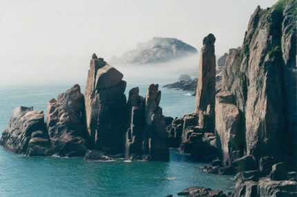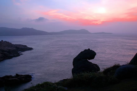 慈航普渡的觀世音菩薩在南麂列島定格、凝固成了高20米的天然巨像,它身披風帔(俗稱“觀音兜”),垂著兩袖,眉目宛然,專注地向東海第面凝視。然而這觀音巖腳下全是刀劍般的礁石,潮來時淹滿水,更像是泥犁地獄了。而在不遠的1.5米外,有5支石柱聳立,其中最高的柱頂,酷似調(diào)皮搗亂和小猴子。它在觀音菩薩面前,有所窺伺,又有所祈求。更令人驚奇的是,景隨步移,若南行數(shù)十步,從另一個角度望,慈目的妙齡觀音卻突然變成了老態(tài)龍鐘的南極仙翁,故人們又稱之“壽星巖”。移步換形不僅平尜游人興趣,而且從“雙面人”身上也不有同感悟。