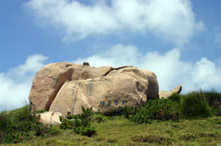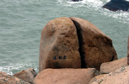 能以人力或風力推動而搖擺的大巖石,在各地勻有發(fā)現(xiàn)。南麂三盤尾石門旁的風動巖卻別有情趣。此石高約5.5米,直徑4米,形如銅鼓,卻裂成兩瓣,一瓣是“靜如處子”分外端莊;另一瓣,凡遇上5級以上大風,便自行搖動,可謂“動似脫兔”,還以發(fā)出悅耳聲響,宛如海底傳來的進軍號角。倘若無風時,那只得勞駕游客,憑力氣去推、去搖。面對風動巖了,聯(lián)想起佛教中關于“風動也,情動也,見仁者自己心動”的“因緣和合”典故,似乎明白了自然景觀中也充滿生活哲理。此巖其自身根基不穩(wěn),加上風的外力,便顯得搖擺不定。