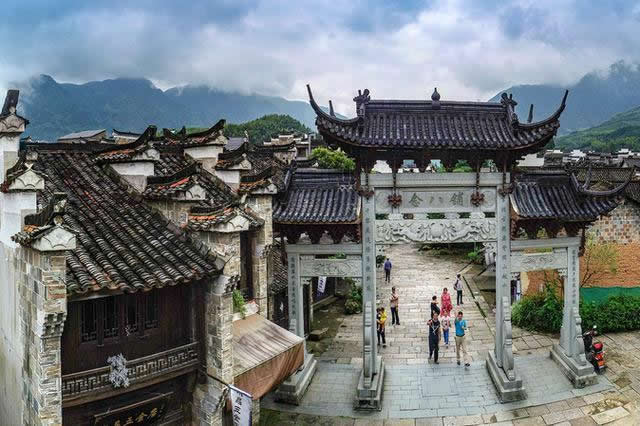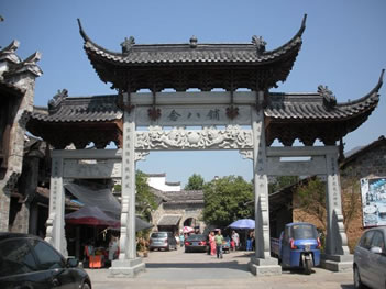 古鎮(zhèn)的大戶有曹、姜、楊、金四家。他們圍繞著宗族而居,至今還保留著36幢完整的古民居大院。站在老街上,最富有特色的是家家戶戶的門楣。門楣多為樓閣式,由梁、枋、檐、望板和垂簾虛柱構(gòu)成四柱三樓式。各個部件都有精細的木雕裝飾,題材多為福祿壽、合和二仙等吉祥物。這木制的門楣和江南其他地區(qū)的磚雕門樓有著截然的反差,使人走在這老街之上,無不被這景色所吸引?催@徽式的馬頭墻、浙式的屋脊、贛式的檐櫞、閩式的土墻,其內(nèi)涵的豐富已足以使建筑學家所驚嘆。