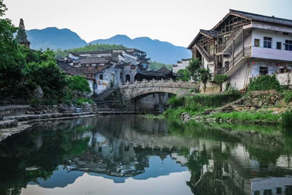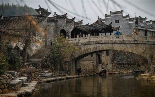 小橋如虹霓跨溪,上面長滿了綠藤,橋下水聲依依,站在不遠處的水埠上,半圓的橋拱與水中的倒影正好構(gòu)成了一個圓,水波蕩漾,恍如一輪圓月,此景被叫做“楓溪望月”確是名不虛傳。