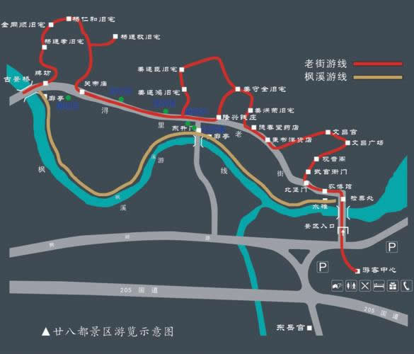 古鎮(zhèn)舊有東西南北四道城門,今唯有鎮(zhèn)南石質(zhì)門額一方,書有“楓溪鎖鑰”。一條街道與小溪并行,自北至南曲折蜿蜒長達1公里。兩旁多為二層樓店鋪作坊,基本保持了19世紀集鎮(zhèn)的風貌。