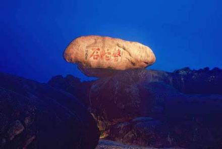 指磐陀石一帶的傍晚景色。由梅福庵西行不遠(yuǎn)處便可看到磐陀石。磐陀石由上下兩石相累而成,下面一塊巨石底闊上尖,周廣20余米,中間凸出處將上石托住,曰磐;上面一塊巨石上平底尖,高達(dá)3米,寬近7米,呈菱形,曰陀。上下兩石接縫處間隙如線,睨之通明,似接未接,好似一石空懸于一石之上。