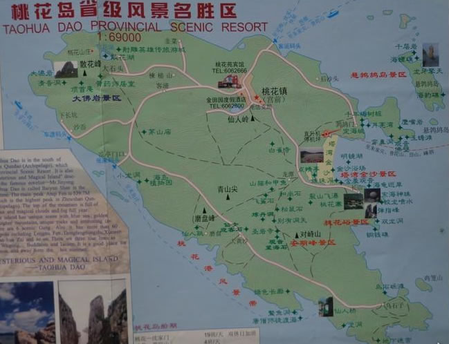 桃花島,擁有舟山群島第一高峰——安期峰;舟山第一深港——桃花港;東南沿海第一大石——大佛巖;是中國(guó)三大水仙名品之一的普陀水仙和浙江名茶普陀佛茶的主產(chǎn)地,又是浙江沿海林木品種最多的島嶼,有著“海島植物園”的美稱。其豐富的自然景觀、人文景觀和神話傳說有機(jī)融合,形成了六大景區(qū),即:桃花峪景區(qū)、塔灣金沙景區(qū)、安期峰景區(qū)、大佛巖景區(qū)、懸鵓鴣島景區(qū)和桃花港景帶,組合成武俠、佛教、道教文化三條旅游專線。擁有金沙日出、金龍吐珠、安期云霧、高山聞鐘、百家朝圣、山石桃花、奇洞探幽、桃港雄姿、礫灘涌潮、林帶煙樹、龍?zhí)逗熤椤⒋蠓鹣φ?2大景觀和大佛巖、彈指峰、東海神珠、清音洞、白雀寺、仙人橋、含羞觀音、龍牙擎天、定海古城、安期煉丹洞等30余處主要景點(diǎn)。