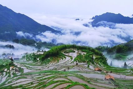 是梯田,是濕地,是澤國,形成亦山亦水的奇觀,來源于森林腹地恒久的涵養(yǎng)補給,只見云水天來,不見旱澇來襲。雨云象俏皮的村姑,出沒無定、行蹤無定,著裝無定,心情無定……忽而為項頸之哈達,忽而為足下之地毯,忽而為纏腰之彩帶,親親云朵,感悟創(chuàng)意。這就是云和梯田——沉浮著的云水世界。