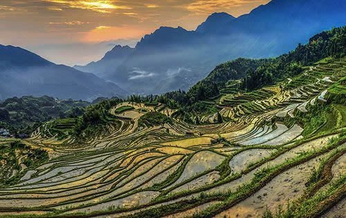 云和梯田如同一位四季美人:春穿花衫,水滿層疇:夏披綠紗,禾海滾浪;秋著紅裳,金穗漫山;冬裹銀裘,雪毯素裝。年復(fù)一年,山花不敗,鳴禽百囀,流泉不竭。日復(fù)一日,從山嵐染成金玫瑰,到白云變幻成蒼狗,一幕幕展現(xiàn)大自然造型和著色的奇詭。