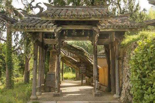 進了山門,邁上幾級臺階,有一個黃土砂礫鋪筑的小天地,右側有石臺階,通向枝桿蒼虬的柳杉王;左側是下坡道,通向時思寺的鐘樓與大殿;迎面是一堵砂石黃泥壘筑的儀門,通向梅氏宗祠。