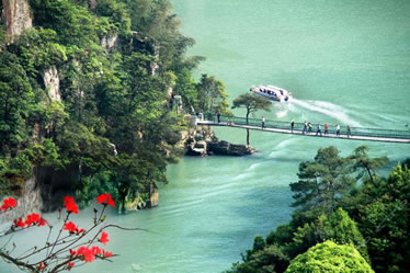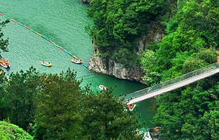 過龍?zhí),潭水平和,為峽谷漂流的登筏之處;懸空橋由鋼索懸架而成,長近70米,高逾40米,上橋行走,凌空晃蕩,不少游客會(huì)為之發(fā)怵心顫,給人以無窮刺激,有人稱之為“勇敢者橋”。五星橋頭設(shè)有山貨市場(chǎng),可供應(yīng)大峽谷內(nèi)的各種特產(chǎn)。
