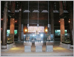 向右進(jìn)一小門(mén)是一小展廳,展示的是諸葛村村民中收集來(lái)的一些原諸葛族人在外經(jīng)營(yíng)藥業(yè)時(shí)保存下來(lái)的藥用器具,有明代的石藥碾、藥壇,有清代的藥碗、錢(qián)稱(chēng)、藥匙、藥壺,還有百年老店“天一堂”清代期間制售的 “諸葛行軍散”、“臥龍丹”、“眼藥膏”!疤煲惶谩、“保仁堂”的藥店印章。